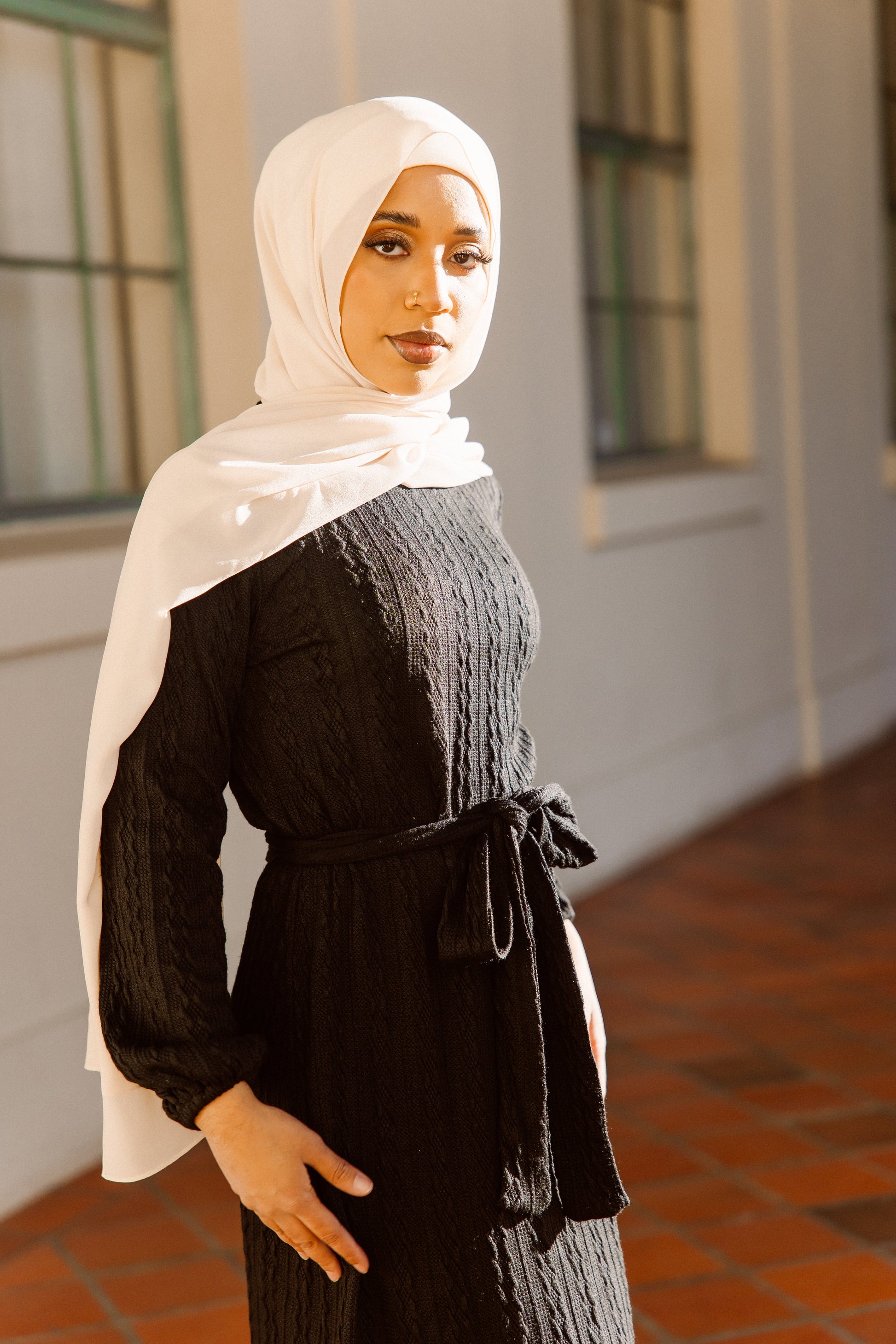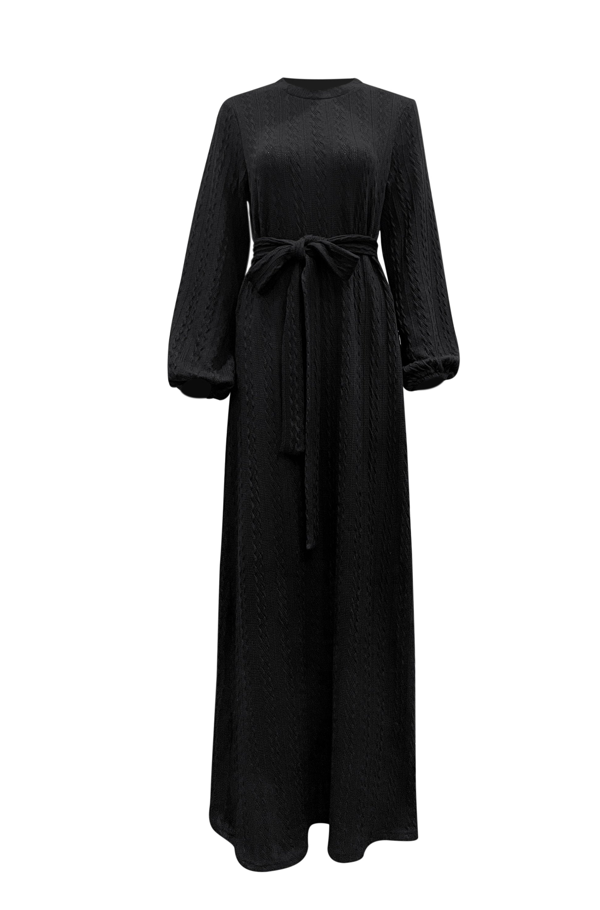 Made with the comfiest of Knit Blend, this dress is the perfect f/w basic for your wardrobe. The intricate knit embossed design uplifts this long sleeve sweater dress maxi. Cinched balloon sleeves, and a round collar define this dress. Our impeccably warm and cozy maxi dresses are available in two classic colors. The Ayesha Maxi Gown is extremely stretchy and of course a fall/winter wardrobe necessity!