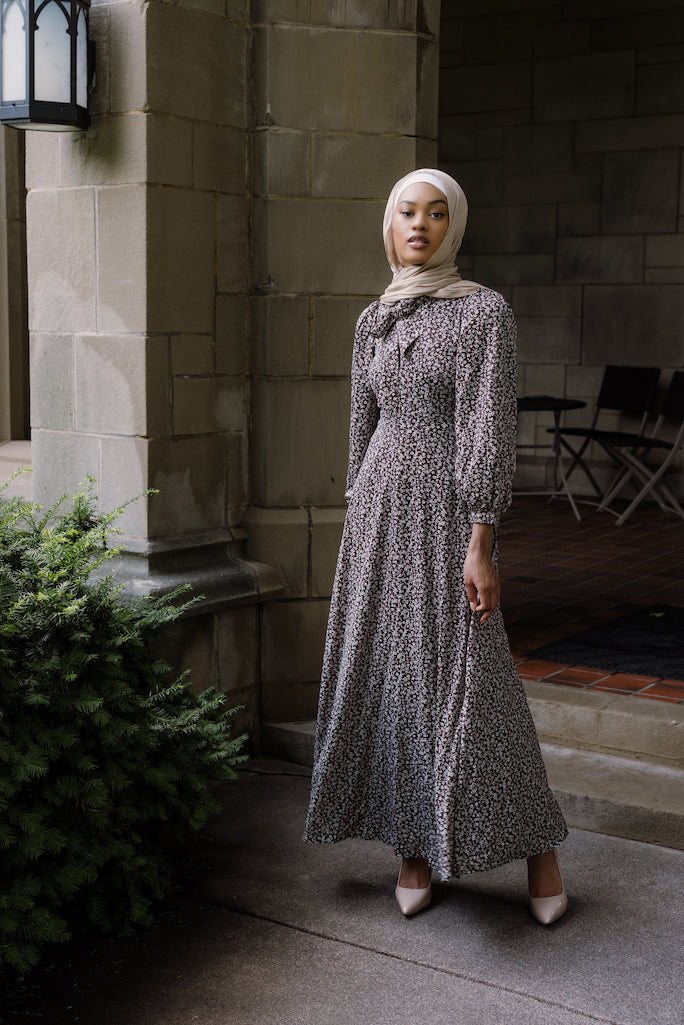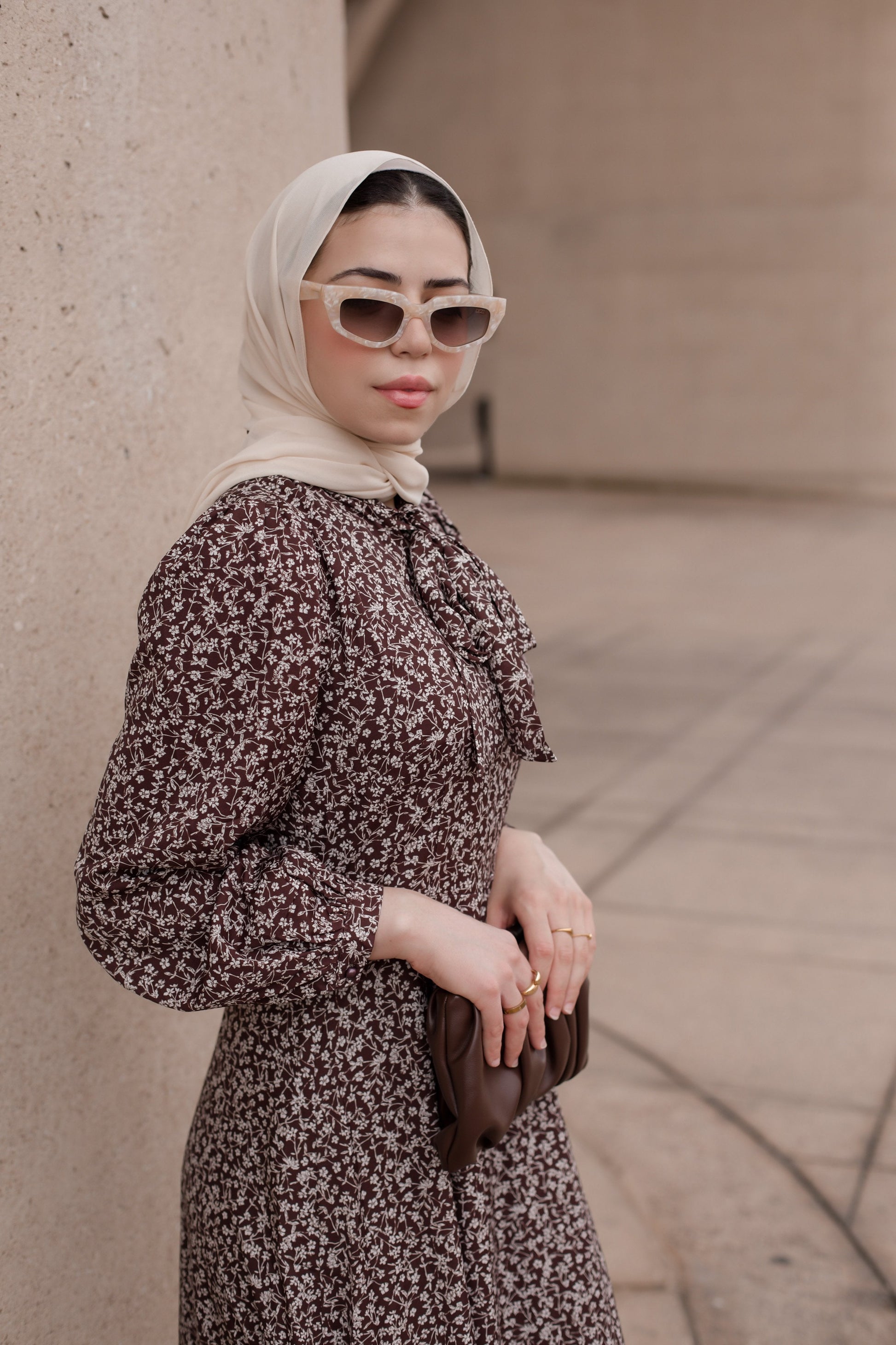 One of our most favorite pieces from the StyledbyDuha X Niswa Fashion Collection. This floral dress features a vibrant pattern of flowers, creating a charming and feminine look. The dress is designed with a cute tie at the neck to add elegance to the look. The lightweight fabric and flowy fit with balloon sleeves, ensures ease of movement while also making it ideal for various occasions, from casual outings to more formal events. The dress combines style and practicality, offering a delightful addition to any wardrobe.