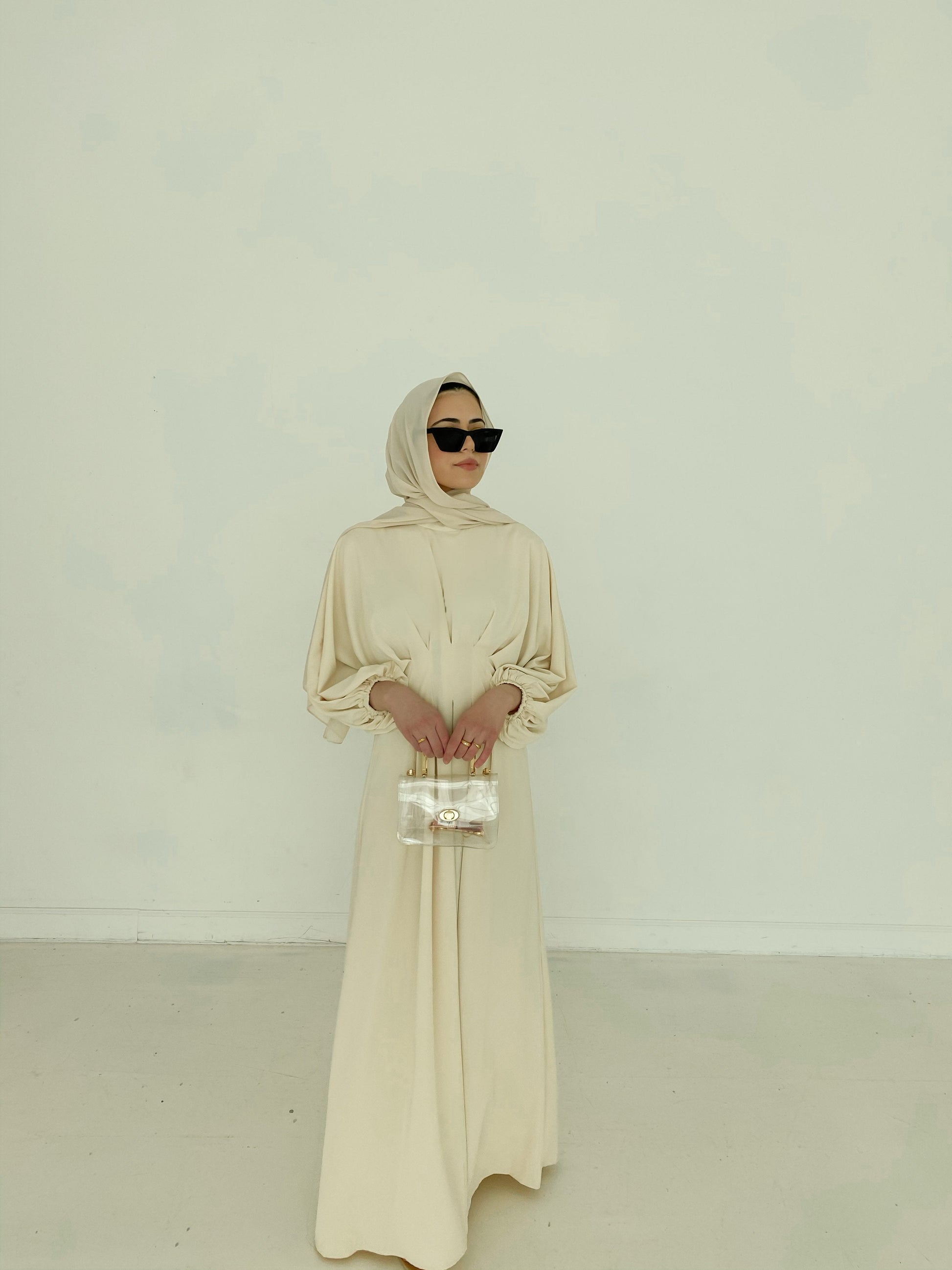 This elegant dress features a cinched and pleated waistline that creates a flattering silhouette. The bodice gracefully gathers into the waist, enhancing the overall fit and adding a touch of sophistication. The flowy sleeves cascade gently from the shoulders, offering a dreamy and ethereal look that complements the structured waist. Made from lightweight, airy fabric, this dress combines timeless elegance with modern charm, perfect for any special occasion.