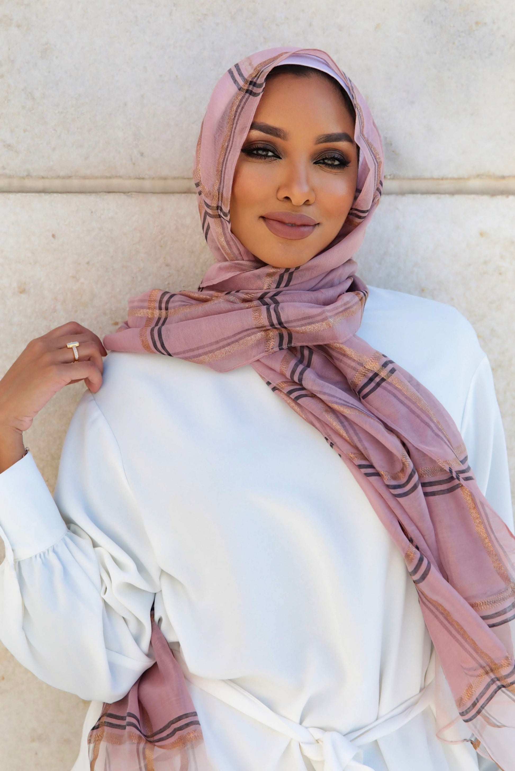 A fun spin on a normal plaid style. This hijab has tartan lines etched across the fabric with a few embossed foil lines that elevate the classy design.