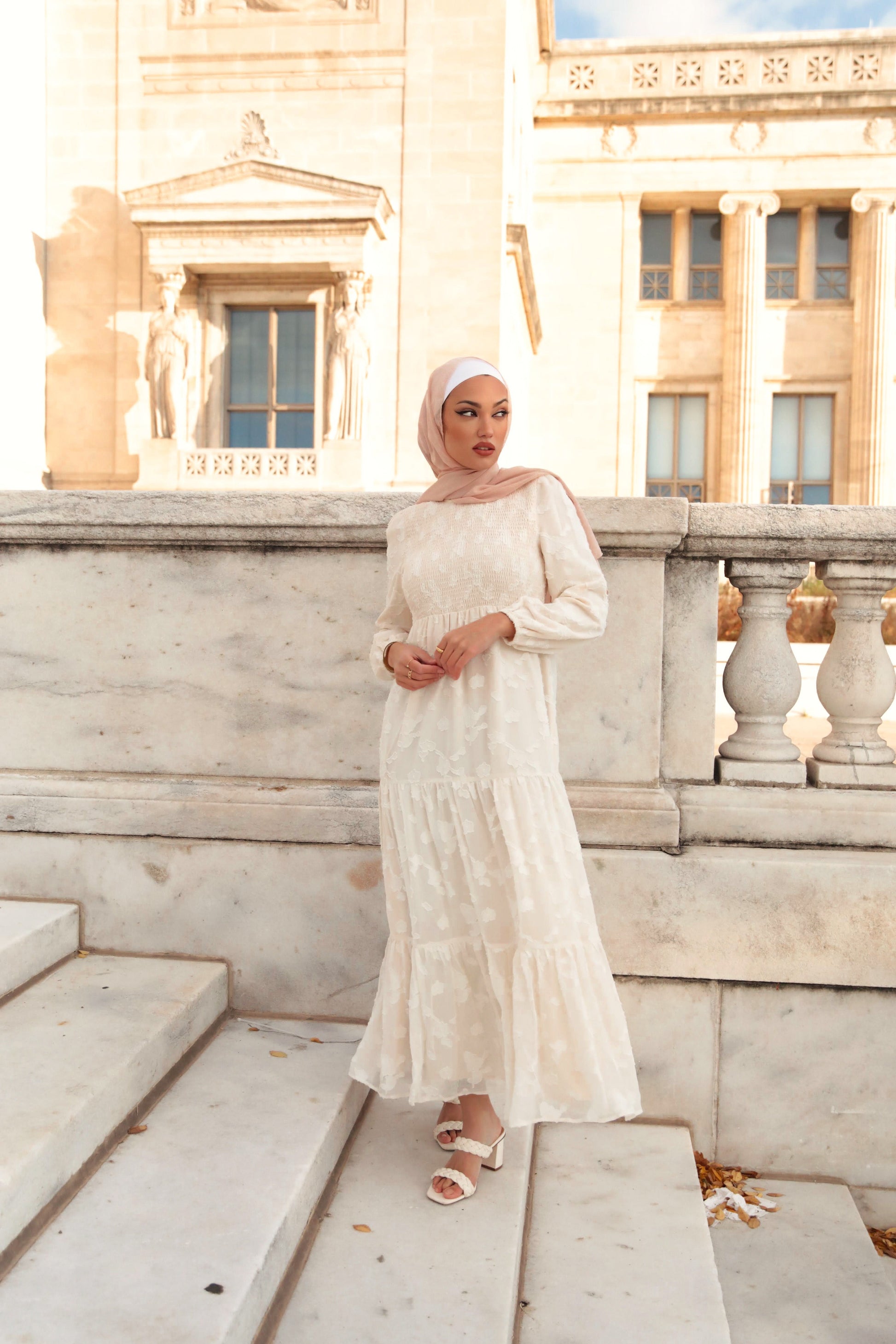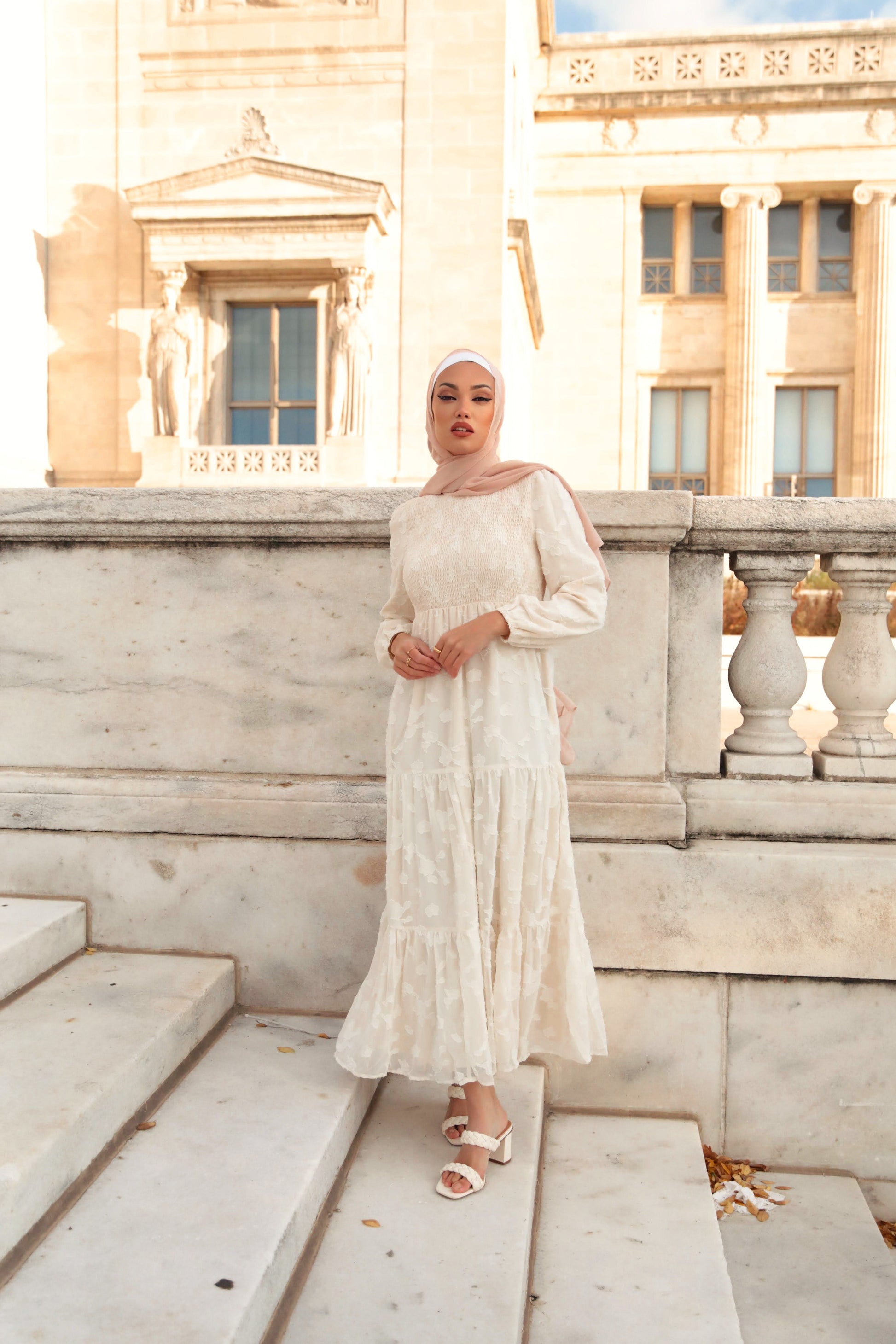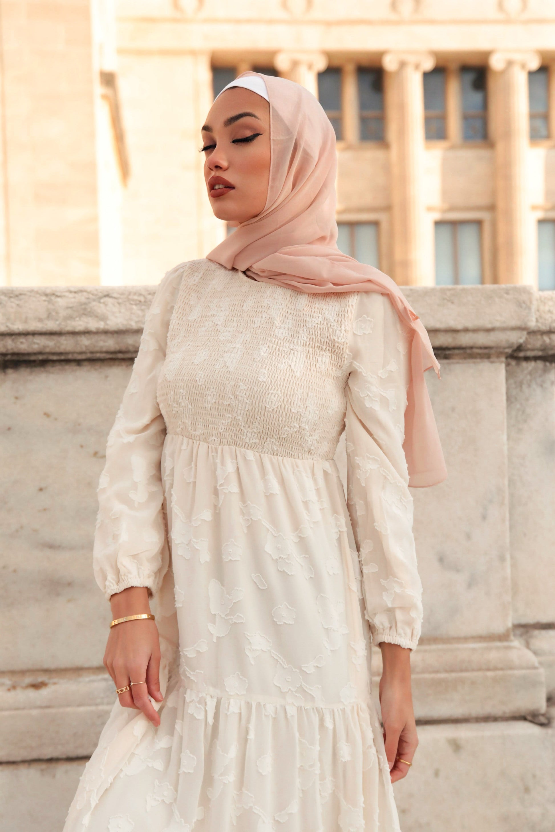 Our absolute favorite from our new collection the Melanie Maxi Dress offers a unique embossed floral print, this dress comes with three layers of a chiffon-polyester blend that accent the skirt for a flowy look under a cinched stretch bodice. A rounded boat collar and ballooned cuffed sleeves, a Niswa staple, complete this dress.