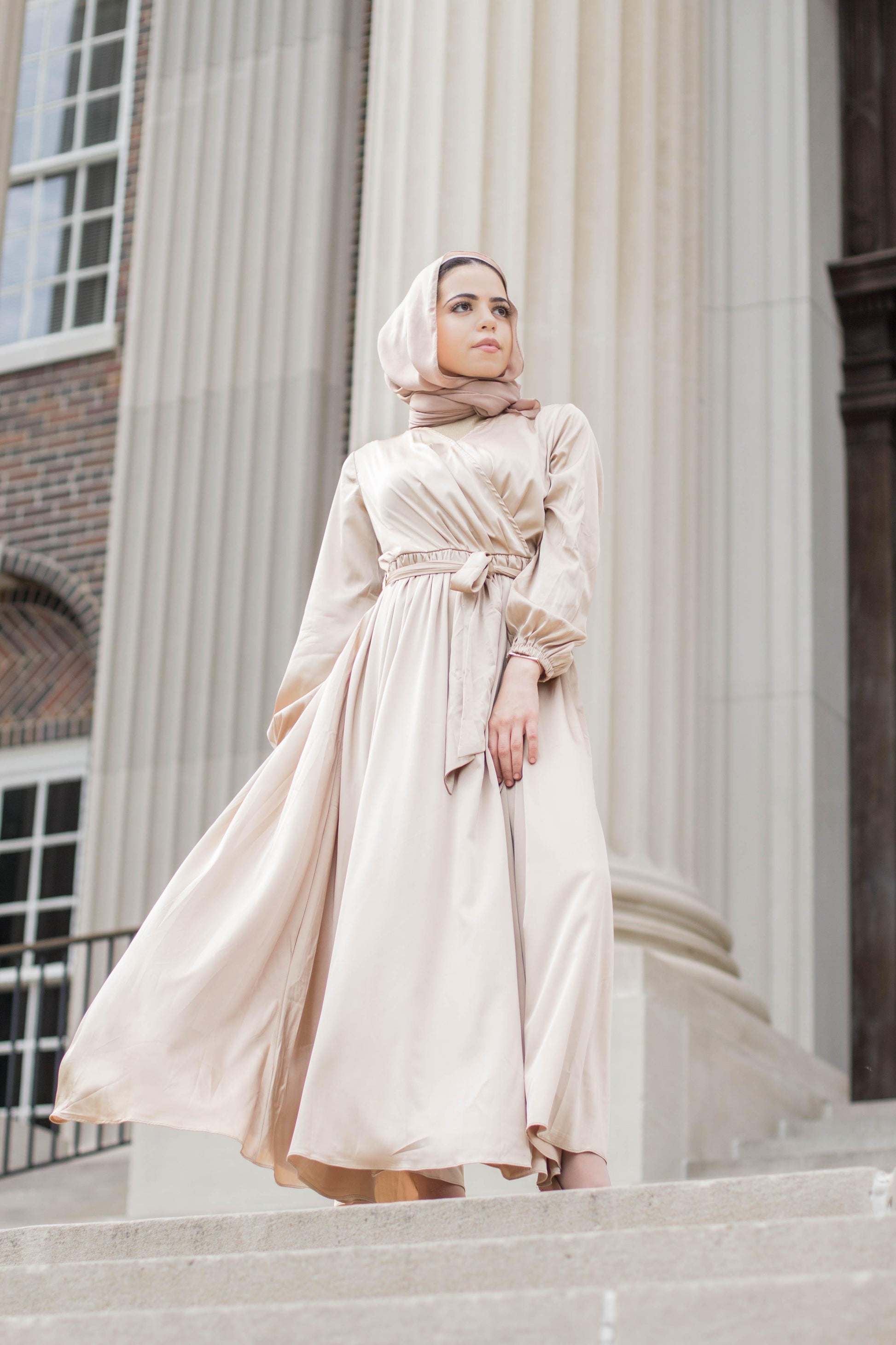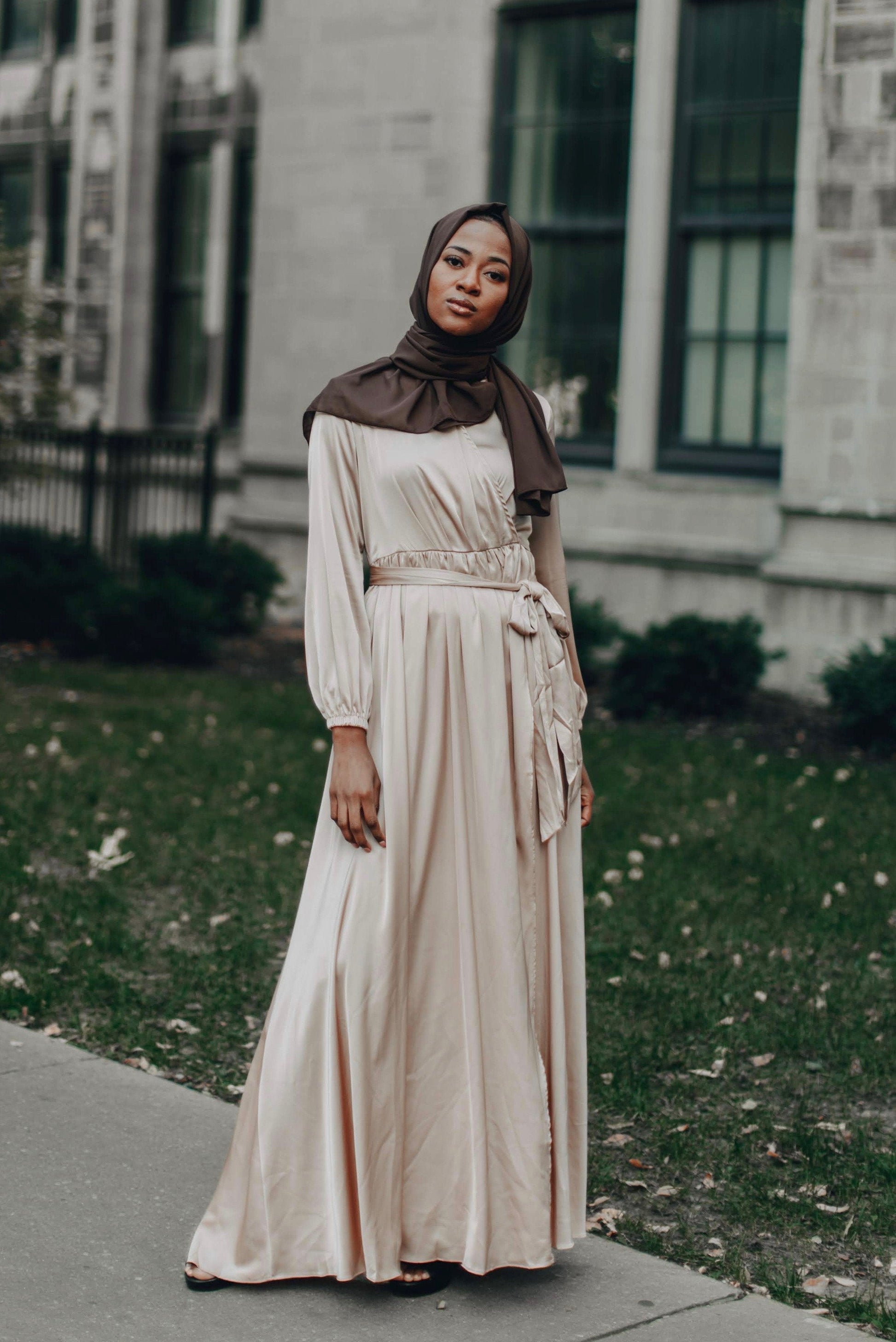This modest satin dress exudes elegance and sophistication with its sleek and lustrous fabric. It features a buttoned high neckline, providing ample coverage, and long sleeves. The bodice is tailored to gently accentuate the waist without being too form-fitting, while the skirt flows gracefully to a full length, offering ease of movement and comfort. The dress includes subtle details like delicate pleats, a simple belt, and discreet buttons to enhance its charm without compromising its modesty. This timeless piece is perfect for formal occasions, religious events, or any setting where understated elegance is desired.