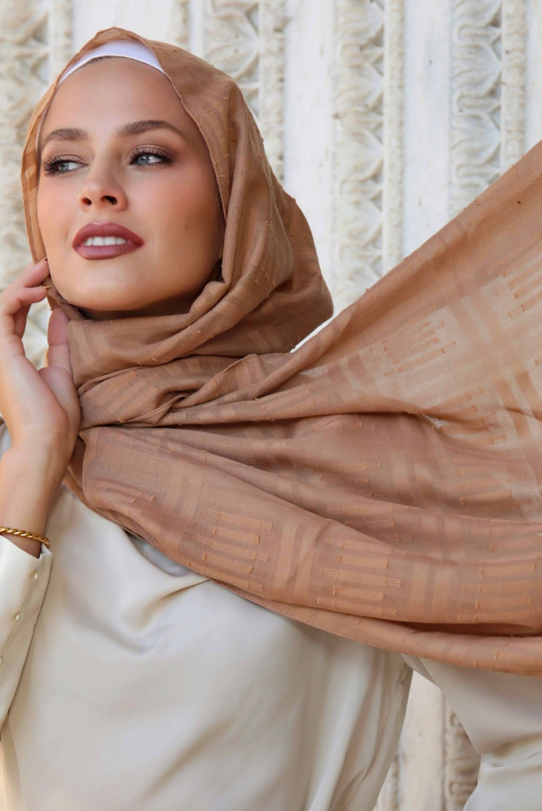 A soft and plush hijab  highlighted by a stunning embossed abstract check pattern. The wide boxes and stripes  create a distinct pattern that is easy to pair with versatile wardrobe choices.