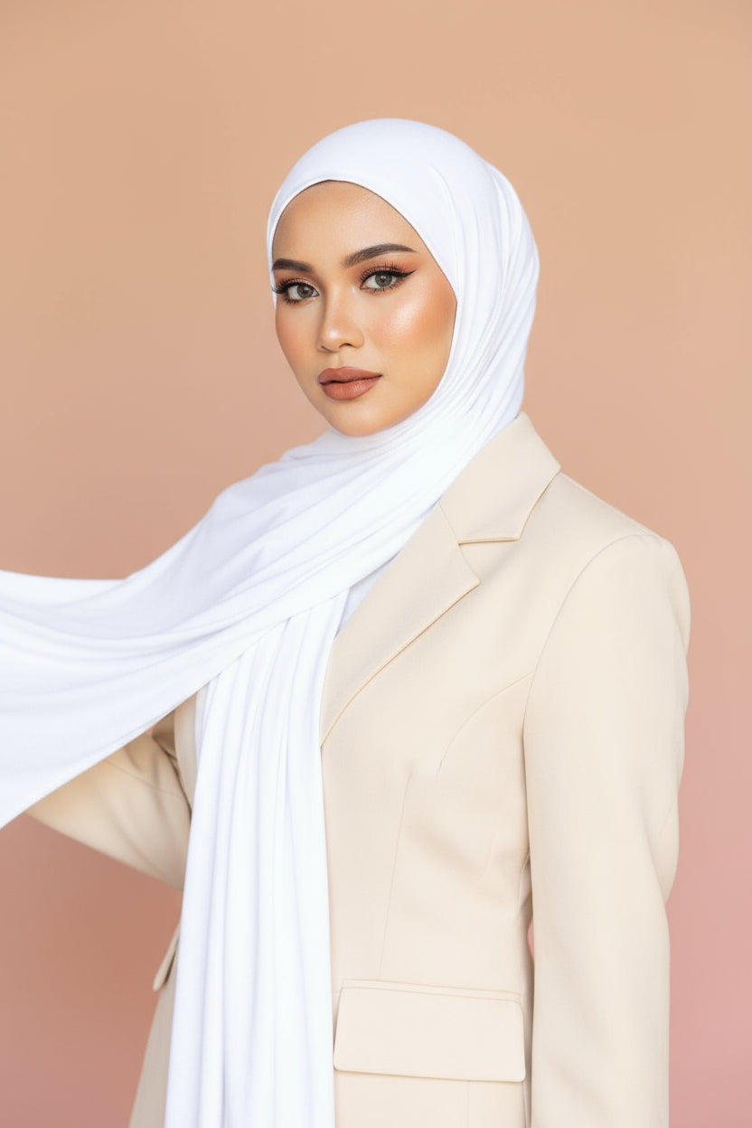 Experience the luxury of our PURE WHITE Premium Jersey sjaal. Crafted from a soft and stretchy cotton jersey blend, this sjaal is not only stylish but also incredibly comfortable. Its long, rectangular shape and lightweight to medium thickness make it perfect for effortless styling. Whether you choose to wear it with or without an under cap, this sjaal is sure to elevate your wardrobe and make a statement.