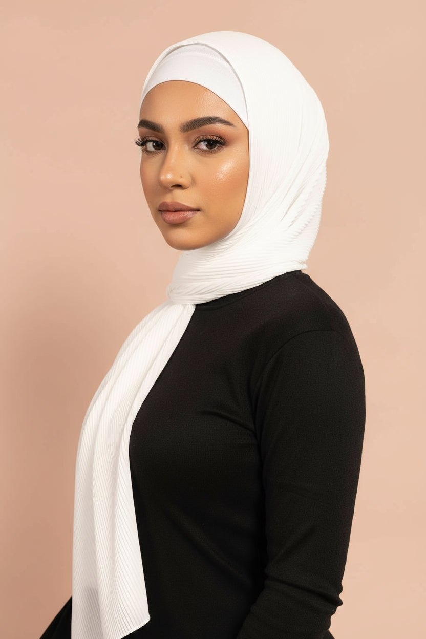 Our Pleated Chiffon in Snow White is a delicate and lightweight scarf with a chic crinkle texture. It's perfect for any occasion, whether you're heading to work, school, or a formal event. This versatile scarf can be easily worn as a hijab or a wrap-around, making it a must-have accessory for your wardrobe. Available in more colors, but this snow white shade is a timeless classic.