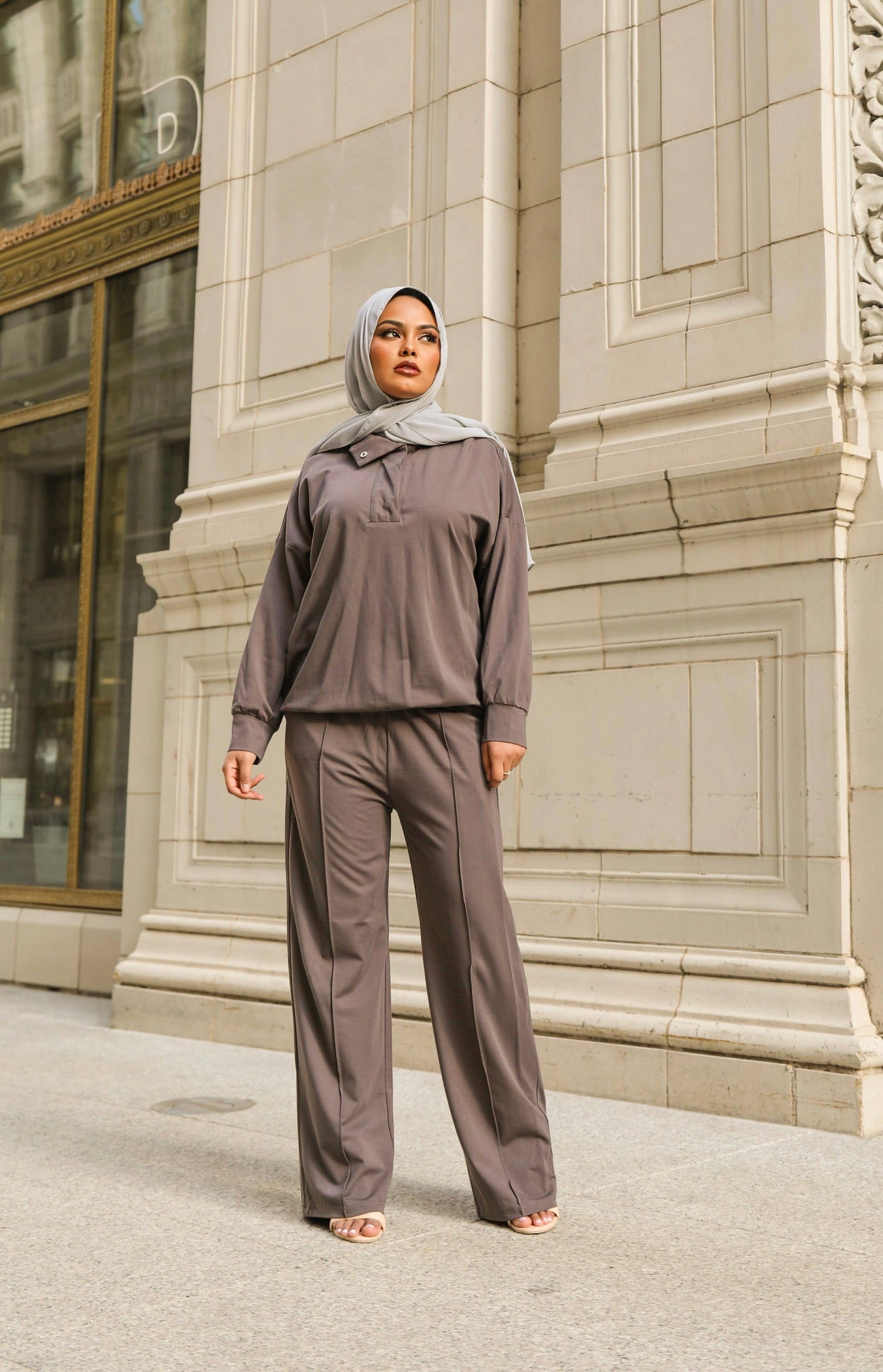 Introducing our latest creation - the ultimate combo of comfort and style! Meet the Relaxed Button Collar Sweatshirt and matching Knit Track Pants, aka the Tory Tracksuit. This new design is like a structured trouser and top that flow together seamlessly or can be rocked separately.